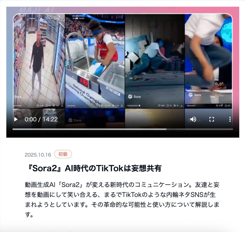 試しにSora2のサムネイルをクリックすると、動画と文章が出てきます。